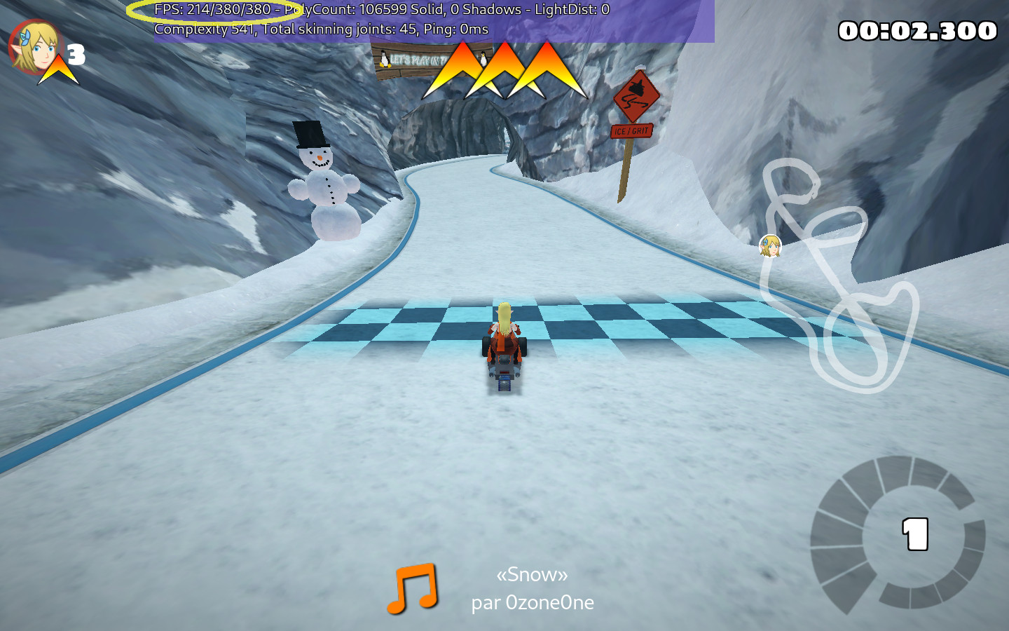 A purple bar then shows up at the top of your screen. It contains three FPS values : minimum FPS, current FPS, maximum FPS. It also contains a few other informations relevant for track creator such as the polycount.